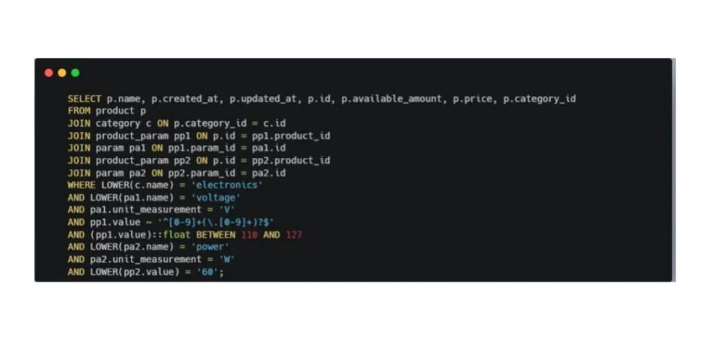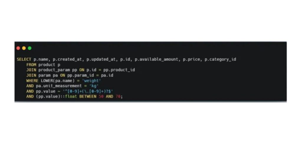 The AI correctly handled the trickiest part of our database: how we store product attributes. In our case, this is a varchar column that can contain either numeric ranges like 20–50 or plain text values such as “gray.”