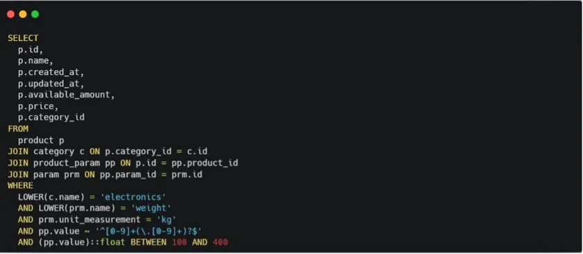 We started with the simplest possible tasks. For example, we asked the model to show all products weighing between 50 and 70 kilograms — and overall, the generated query worked.